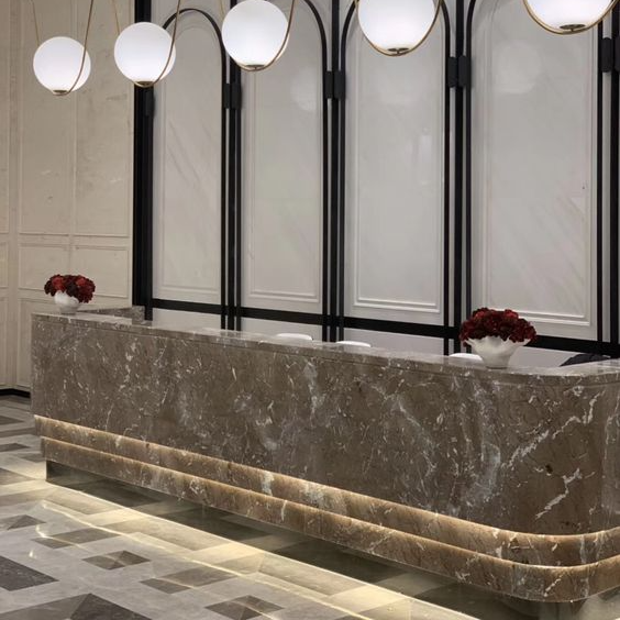 Выбор разных видов камня позволяет подобрать материал для изготовления стойки ресепшн под любой интерьер.